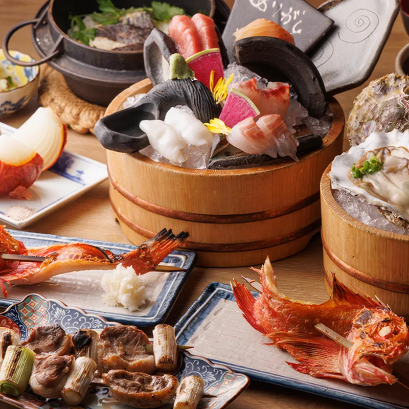 新鮮な魚介や旬菜を炉端焼きならではの原始焼きで素材の旨味を堪能できるコースとなっております。戻りガツオの黒焼きから始まり、鮭の塩こうじ漬け串、熟成牛ハラミ串、玉ねぎとホクホクのじゃがいも串など炭火でじっくり火を通す事で素材の旨味をご堪能頂けます。150分の飲み放題とともに当店自慢のお料理を心ゆくまでお楽しみ下さい。